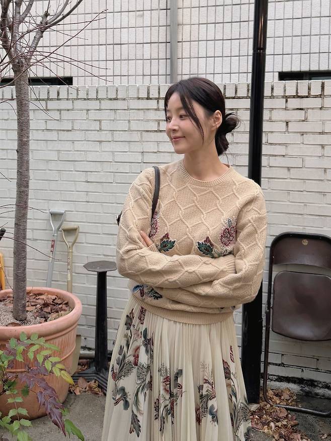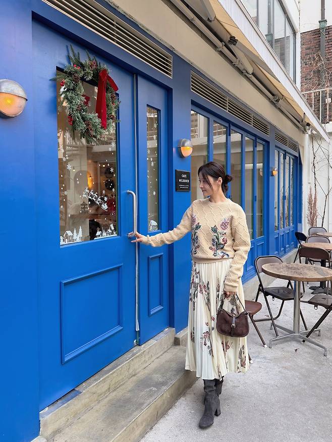 격자무늬 짜임 위에 화사한 꽃 자수가 수놓아진 베이지색 니트를 메인 아이템으로 선택해서 시각적으로 매우 따뜻하고 풍성한 인상을 줍니다.