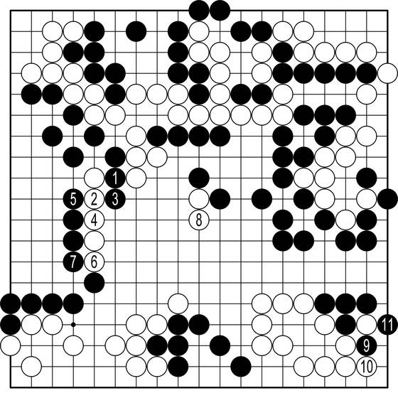 ◆실전 진행1=실전이다. 흑1, 3으로 돌파하며 중앙을 결정지어 간다. 백8이 놓이자 하변 흑 사활에 압박이 강해지고 있지만, 신진서 9단은 흑9, 11로 눈에 보이는 마지막 큰 곳을 둔다.