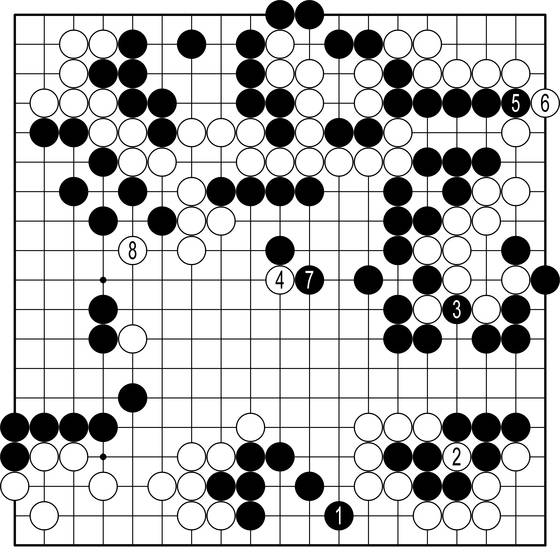 장면⑨=반집 승부다. 숨 막히는 끝내기가 시작됐다. 변의 끝내기나 귀의 끝내기엔 나름의 계산법이 존재한다. 하나 이 판의 끝내기 무대는 ‘중앙’이다. 일반적인 계산법이 통하지 않는다. 과거 ‘신산(神算)이라 불린 소년 이창호가 중앙을 계산했고 서봉수 9단은 “부럽다”며 그걸 극찬했다. 이 판은 중앙의 모호함 외에 또 하나의 중대한 변수가 있으니 바로 하변 흑 사활이다. 흑1로 삶의 형태를 취하자 백2로 따냈고 흑도 3으로 따내며 차례로 큰 곳을 둔다. 백4로 중앙을 견제한 뒤 8까지 들어간 수가 날카롭다. AI의 블루 스폿이다.