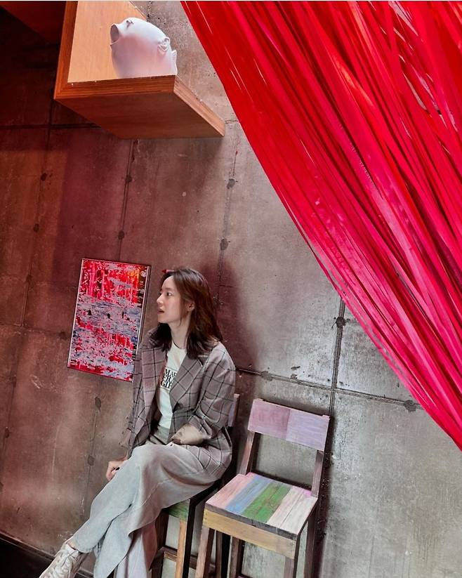 문채원은 클래식한 체크 패턴의 블레이저를 선택해 모던한 가을 분위기를 연출했습니다.