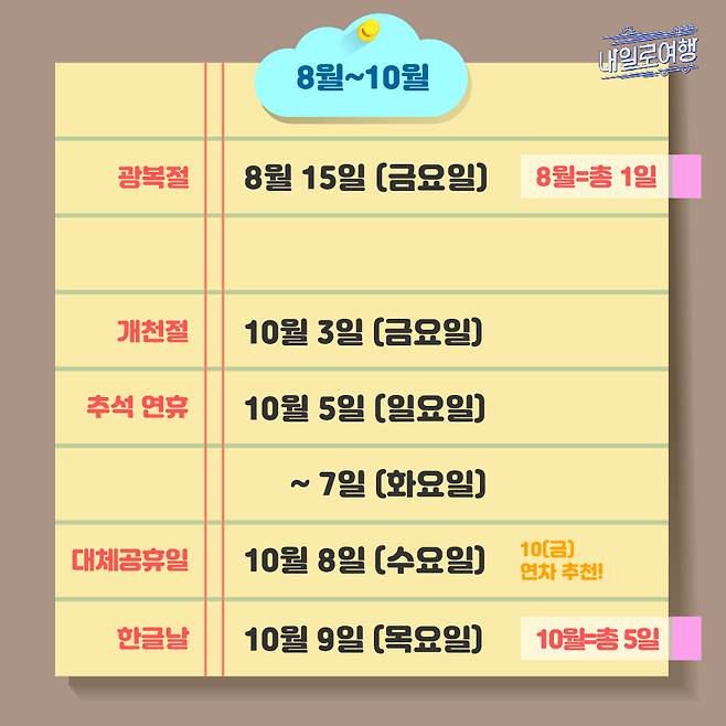 8월~10월🌟 광복절: 8월 15일 (금요일)🌟 개천절: 10월 3일 (금요일)🌟 추석 연휴: 10월 5일(일) ~ 7일(화)🌟 대체공휴일: 10월 8일 (수요일)🌟 한글날: 10월 9일 (목요일)☝️ 10일(금) 연차 쓰면 10월 황금연휴 가능!