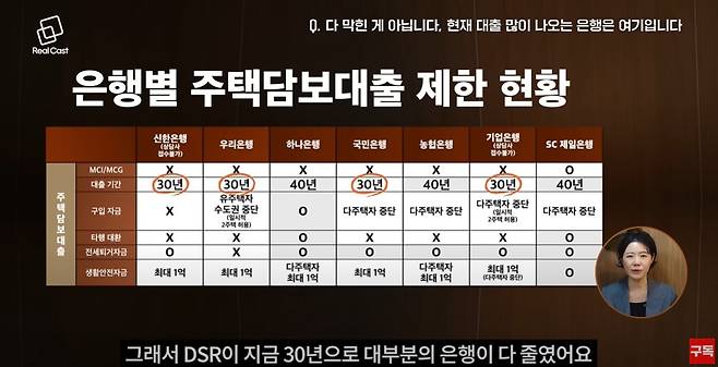 또한 현재 모든 은행 대출이 막힌 게 아닙니다. MCI를 쓸 수 있는 은행이 제일은행이 남아 있고 DSR도 하나은행과 제일은행이 40년입니다. 그리고 전세대출도 하나은행과 제일은행은 가능합니다.
