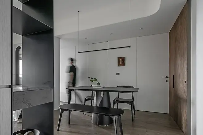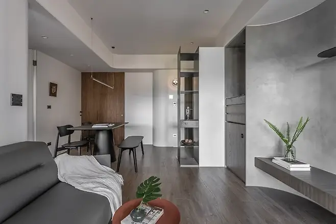 부드러운 선형 구조가 공간을 감싼다. 직각의 예리함 대신 곡선이 일상을 품는다. 월넛 컬러의 깊은 색감은 마치 고택의 단아함을 떠올리게 하며, 벽면을 따라 퍼지는 콘크리트 질감은 깨끗하고 담백한 분위기를 만든다.
