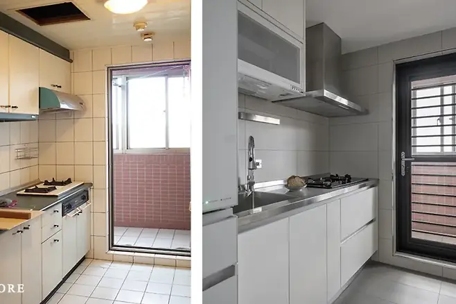 화이트 톤의 주방이지만 금속과 원목의 조화로 차가움보다 절제된 온기를 담았다. 상부장 대신 열린 공간을 확보해 조리 중 시야를 방해하지 않으며, 가전은 필요한 만큼만 노출된다. 조리 동선도 철저히 계산되어, 전기 포트와 칼꽂이는 자석형태로 벽면에 밀착시켜 깔끔한 인상을 준다.