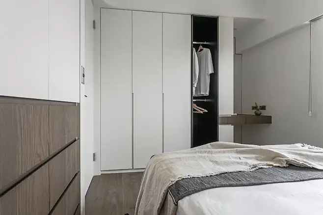 수납과 동선의 균형이 절묘한 안방은 좁은 공간에서의 최대치를 끌어낸 구성이다. 벽면을 따라 제작된 옷장은 의류의 길이와 사용 빈도에 따라 세분화되었고, 서 있는 상태에서도 쉽게 사용할 수 있는 화장대가 추가된 것이 특징이다. 긴 거울과 수납장 위 플랫폼이 유기적으로 연결되어 있어 작은 물건도 분류 정리가 가능하다.