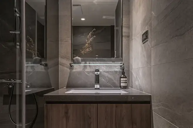 짙고 옅은 회색이 교차되면서 물기를 숨기고, 마치 산속 온천의 자연스러운 재료처럼 보인다. 세면대 옆은 모두 수납장으로 처리되어, 필요한 물건이 겉으로 드러나지 않도록 고려되었다.