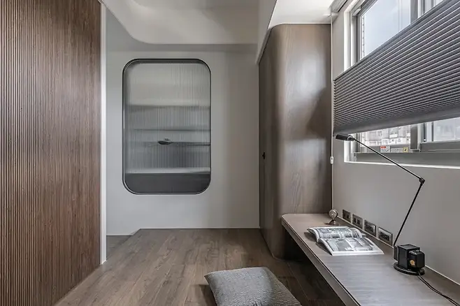 게스트룸은 책상과 침대 기능이 유연하게 통합된 다목적 구조다. 월넛 원목 소재를 벽에 따라 배치해 균형감을 더했으며, 창가의 평상은 앉아서 독서를 하기에 최적화된 높이다.