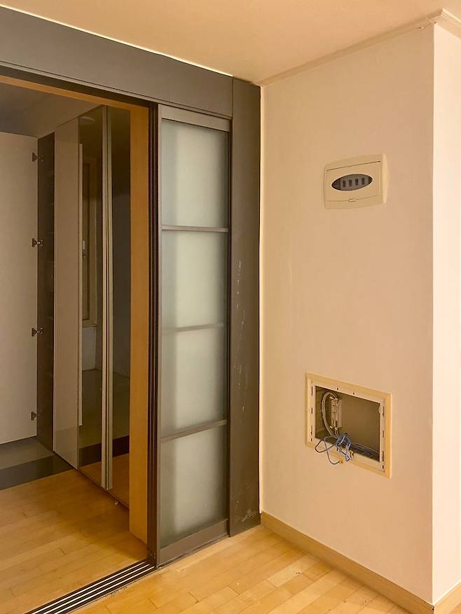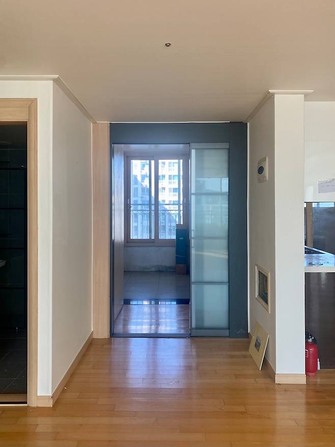 공사 전 중문은 미닫이 방식이었고 복도는 짧은 형태로 거실과 분리되지 않고 이어져 있는 느낌이였어요.