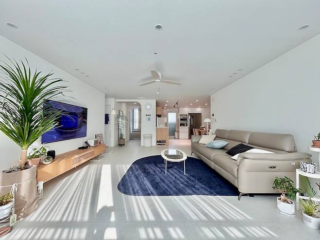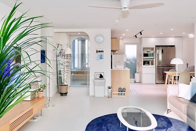 창문 쪽에서 거실을 바라본 모습이에요. 저는 식집사라 일조량과 통풍이 잘 되는 지가 정말 중요했는데 이 전집은 남향이긴 했지만 겨울에 통풍을 잘 못 시켜 주어서 식물들에게 미안했거든요! 이번엔 실링팬을 설치하게 되어서 통풍도 문제없고 찐 남향 집이라 일조량도 좋아서 식물들을 잘 키워낼 수 있을 것 같습니다.