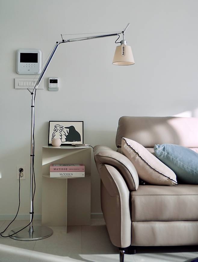 사이드테이블도 그대로 같이 왔어요. 철제라 정말 튼튼하고 색상도 질리지 않고 사이즈가 딱 사이드 테이블로 쓰기 좋아요. 그 옆에 새로 들인 조명은 아르떼미데 스탠드 조명이에요.