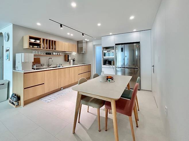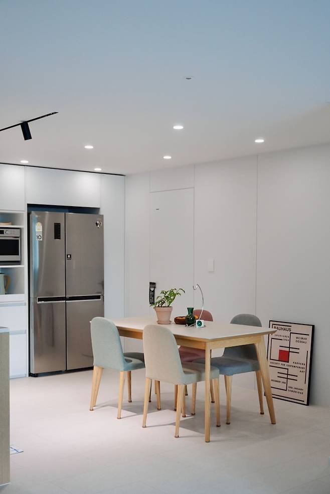 냉장고장 앞쪽에 식탁을 놓았는데요. 펜던트 조명 없이 마그네틱 조명만으로도 식사 시 불편함이 없이 매우 밝아요.