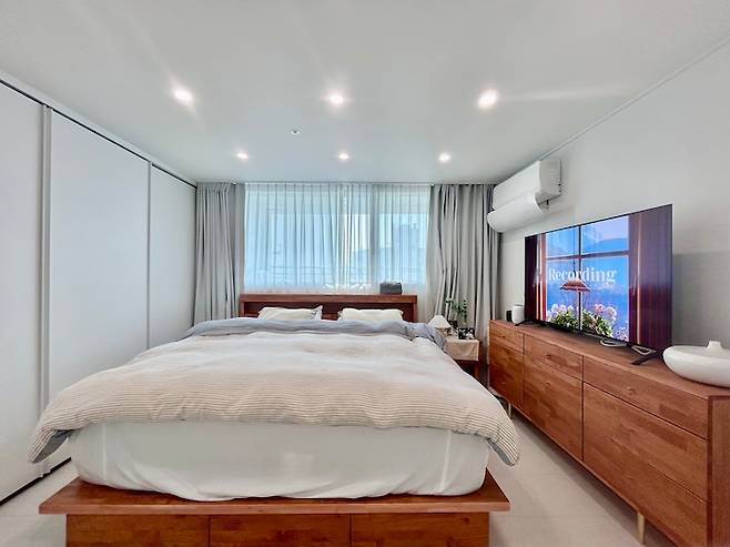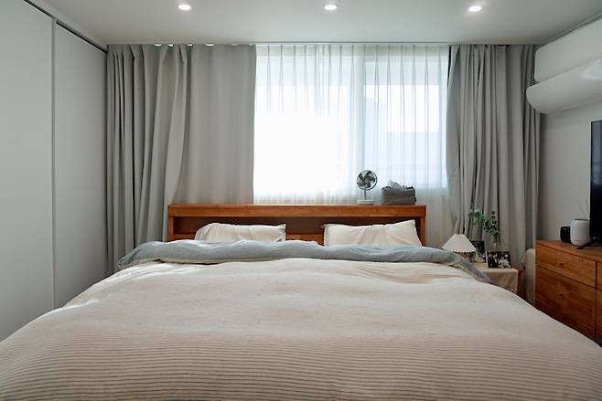 침대를 기준으로 왼쪽에는 붙박이 장을 짜 넣었고, 오른쪽에는 TV장을 배치했어요.