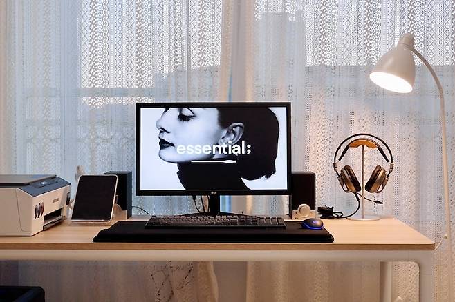 컴퓨터 책상은 군더더기 없이 우드&화이트로 깔끔한 제품으로 선택했어요. 1600mm 넉넉한 크기로 한 쪽에는 복합기도 놓을 수 있답니다.