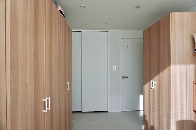 공사를 하면서 복도 부분을 좀 더 늘리고 신발장 한 칸을 줄인 대신, 복도 옆에 수납 가구를 짜 넣었습니다. 가구 손잡이는 이케아에서 저희가 직접 골라서 사온 제품이랍니다.