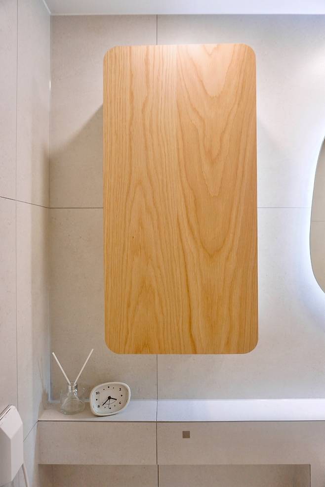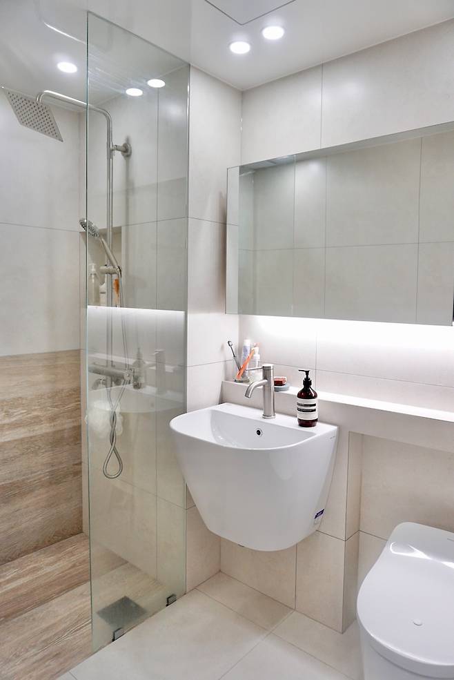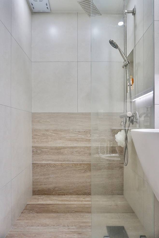 샤워부스는 하단만 우드타일로 시공을 해서 미끄럽지 않게 하면서도 따뜻한 느낌으로 연출하고 싶었어요. 나머지 밝은 타일은 거실화장실과 같은 타일로 사이즈가 커서 청소가 쉽다는 장점이 있어요.