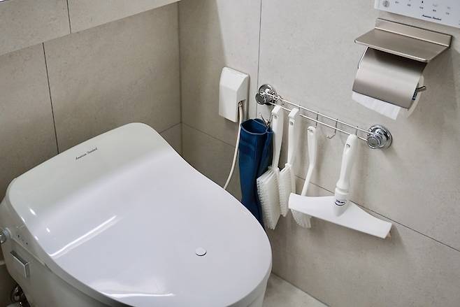 욕실 한 켠에는 청소할 수 도구를 걸어 놓았어요. 바이칸 제품은 제가 써본 욕실 청소 용품 중에 최고에요!