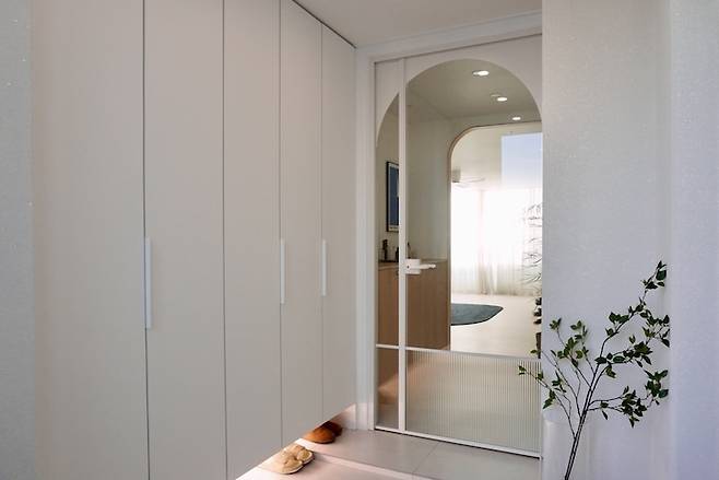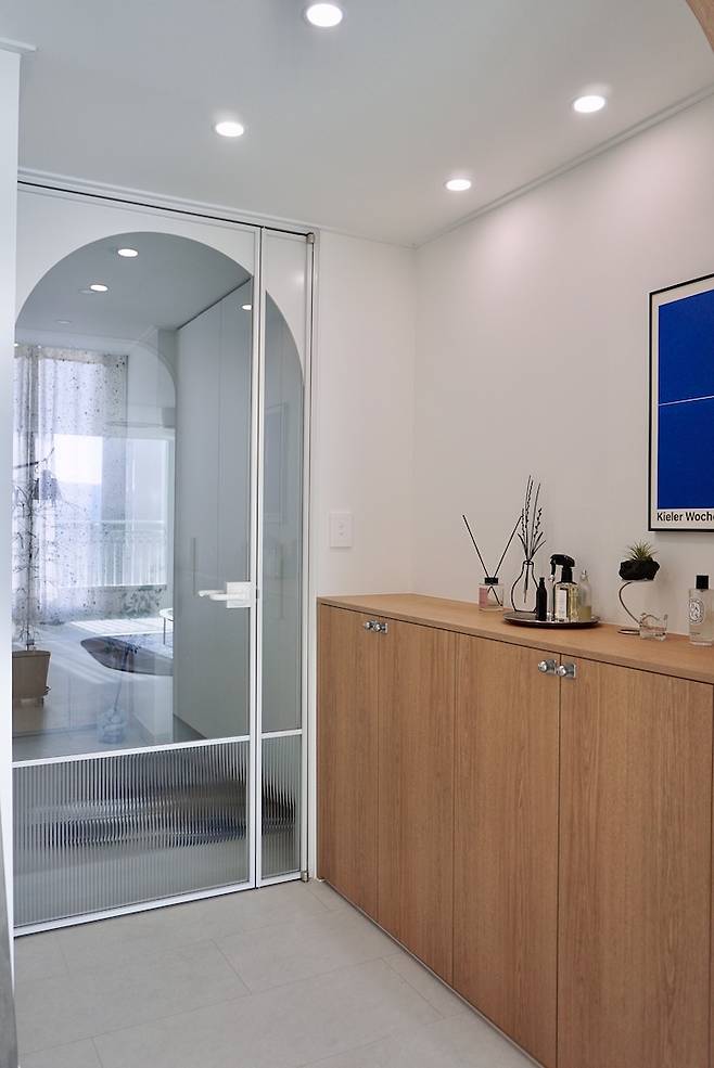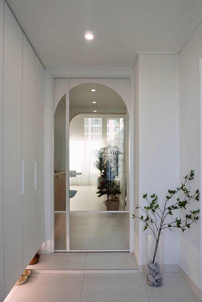 중문은 아치 포인트에 밑 부분은 모루유리 처리된 제품을 선택했구요. 신발장 생삭은 매트 화이트로 선택해 현관을 더 넓어 보이게 시공 했어요. 손잡이는 가장 간결하게 마무리 되는 제품으로 골랐구요.