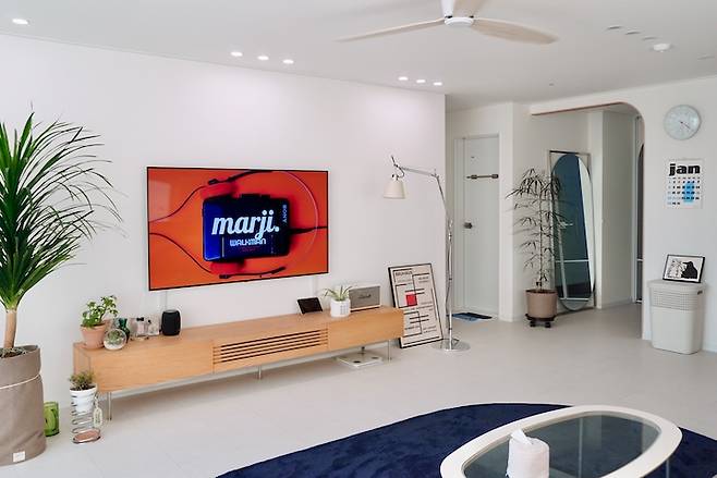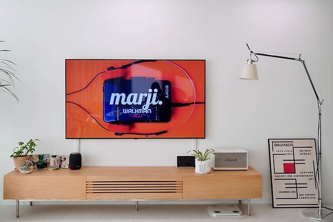 TV는 65인치로 멀리서 보면 큰 편은 아니지만 33평 거실에 크지도 작지도 않고 딱 적당한 느낌이에요. TV장 옆 바우하우스 포스터는 느낌 있게 툭 놓아주면 시크한 소품이 되면서 미운 콘센트도 가려주어서 일석이조!