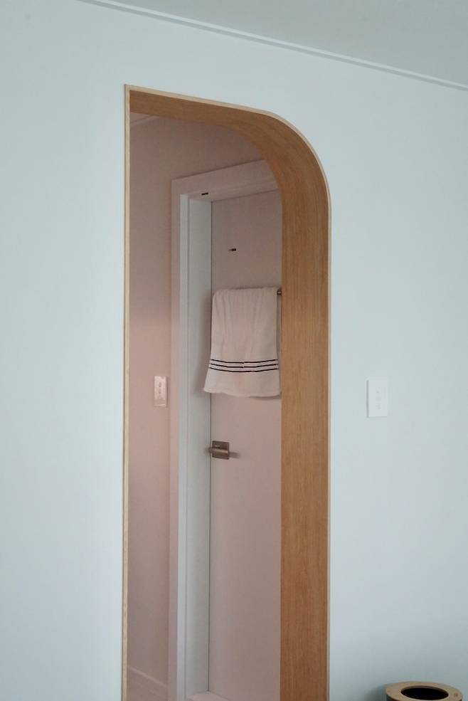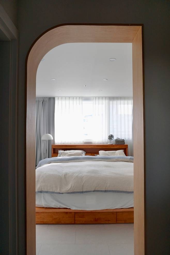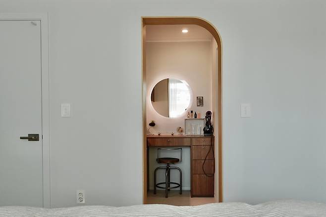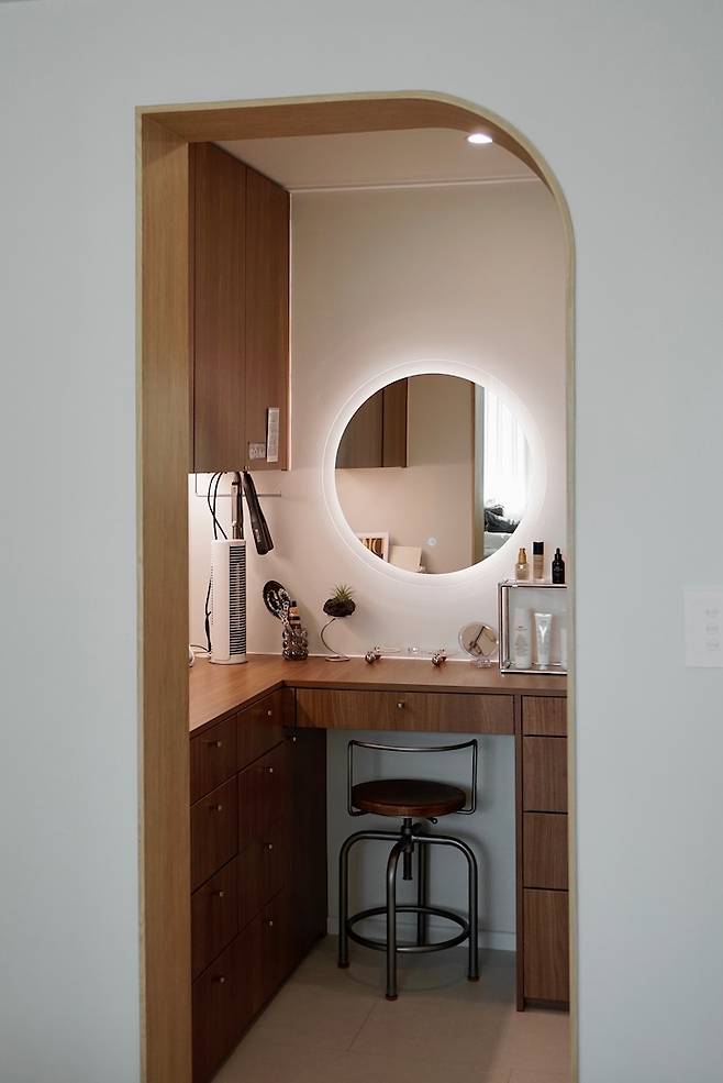 침대 쪽에서 본 파우더 룸 이에요. 입구 부분은 저희 집에 포인트인 반 아치로 만들어 보았어요.
