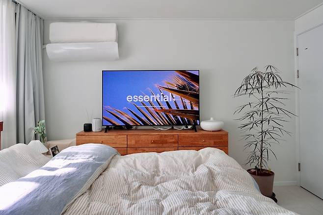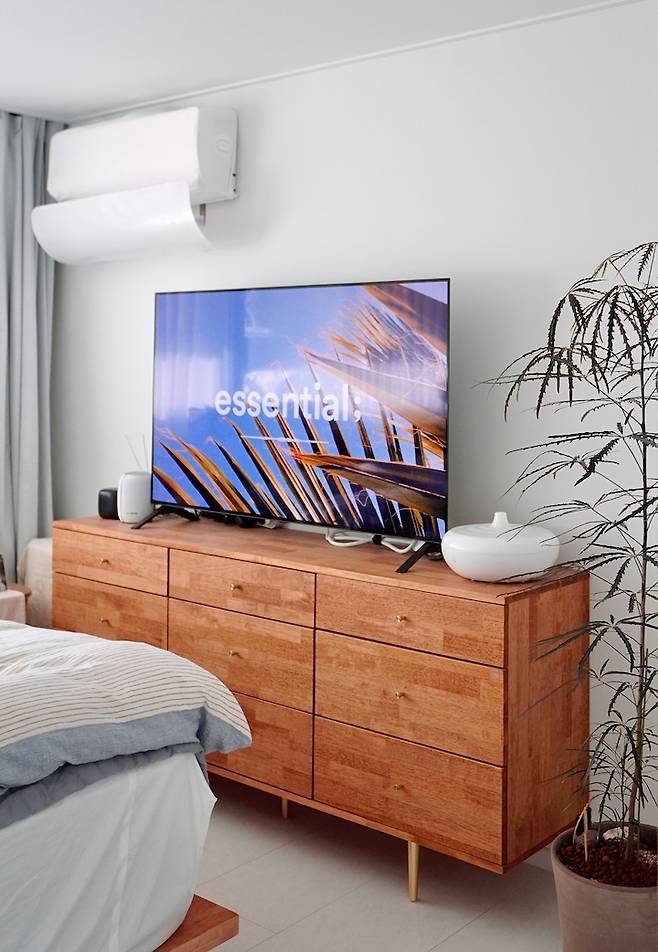 침실에는 TV장겸 서랍장으로 사용할 수 있는 가구를 들였구요. 콘솔 형식이라 가구 밑 부분 청소하기가 좋아요. TV 사이즈는 거실TV보다 한 사이즈 작은 55인치입니다.