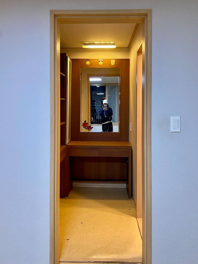 파우더룸은 안방 화장실에 들어가기 전 공간이에요. 가구는 오래되어서 주저앉고 바닥은 똑같이 장판으로 되어있는 상태였어요. 조명도 노란색으로 화장하기에는 알맞지 않은 색상이었어요.