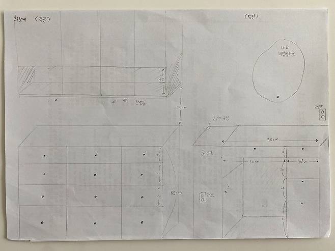 제가 꿈꾸던 주방을 실현 시켜 보려고 열심히 그려본 가구 시안이에요. 조리대는 1자로 만들고 없던 냉장고장은 새로 만들어 넣으면 좋을 것 같다는 생각을 했어요.