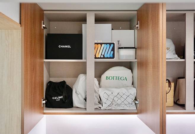 컴퓨터 책상 옆에 보면 또 수납장이 있어요. 수납장이 정말 많죠? 골프백과 남편 가방을 보관중이에요.