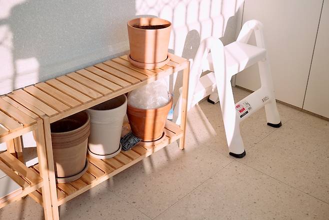 이 타일은 해가 들어오면 또 다르게 따뜻한 색상으로 보여져요. 우드 선반도 잘 어울리는 것 같아요. 봄이 되면 실내에 들여놨던 식물들을 여기 선반에 놓아줄 예정이에요.