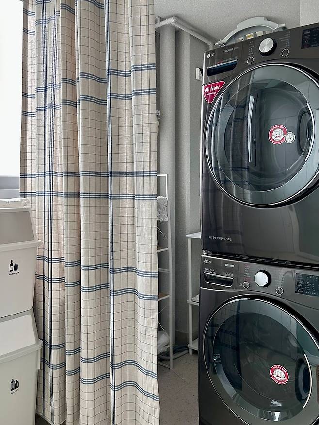 팬트리 반대 쪽은 보일러와 세탁기가 있는 공간이에요. 이쪽은 미운 공간이라 가릴 수 있는 예쁜 커튼을 하나 설치해주었어요. 무타공으로도 튼튼하게 잘 매달려있습니다! 커튼 안쪽은 버려야 하는 박스 보관, 과일,채소, 쌀 보관 등 그런 용도로 쓰이고 있어요.