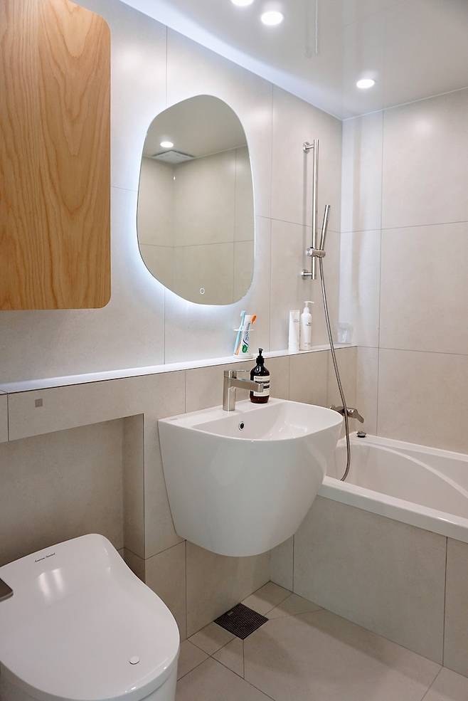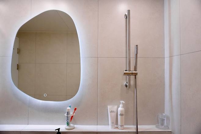 거울은 비정형 LED 거울로 구매해서 설치했어요. 비정형 거울도 정말 요즘엔 가지각색 여러가지로 제작되더라구요.