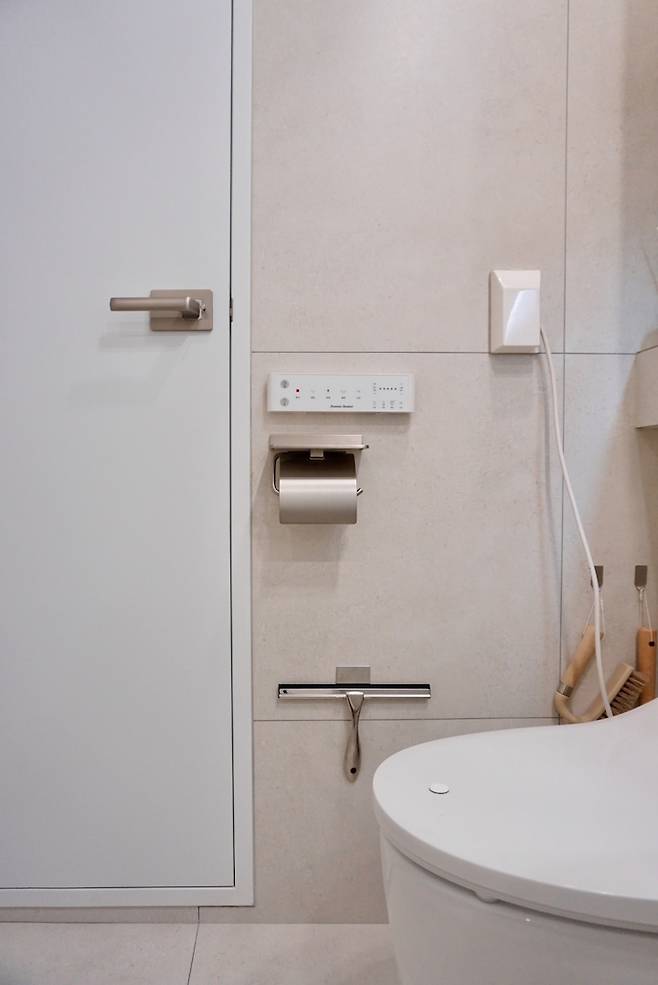 저희 집 모든 도어의 손잡이는 도무스 712제품이에요. 화장실 문도 마찬가지고요. 화장지 걸이를 매립하지 않은 이유는 매립해두면 매립한 안 쪽에 화장지 먼지가 엄청나게 쌓인 답니다. 핸드폰 정도 올려둘 수 있는 깔끔한 제품이 가장 관리도 편하고 최고인 것 같아요.