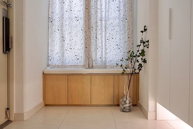 현관문 바로 왼쪽에는 앉아서 편하게 신발을 신을 수 있는 벤치를 설치했습니다. 벤치 겸 수납도 가능해서 신발이나 다른 물건들을 넣어 놓을 수 있어요. 벤치 위에 푹신하게 앉을 수 있도록 발수 기능이 있는 패브릭 매트를 주문제작했어요.