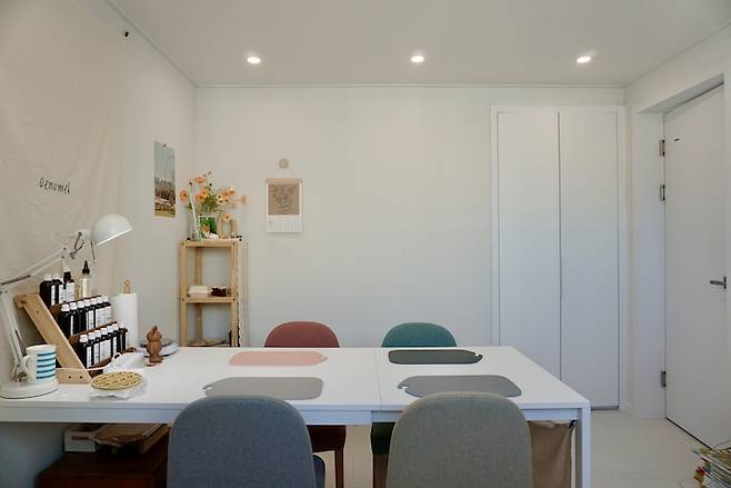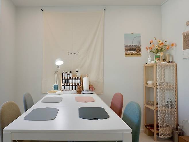 비누나 캔들을 만드는 홈 공방으로 운영되기도 하면서 제 취미 방으로도 쓰이고 있답니다. 테이블은 이케아의 확장형 테이블로 테이블 짧게 두어 쓸 수도 있고 사진처럼 길게 빼두면 6명 정도 앉는 게 가능해요.
