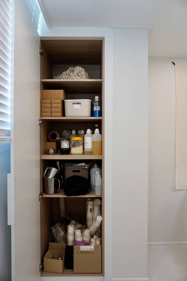 팬트리는 수납장은 모두 손잡이 없는 푸쉬 형식으로 하였어요. 가운데 긴 지지대는 장이 내려 앉지 않게 해주는 역할을 하고 있으니 꼭 설치를 해야하구요! 팬트리를 양쪽 다 제작하고 보니 한쪽은 서브 냉장고 자리로 둘걸 그랬나 싶은 생각도 살짝 들긴 했어요., 나중에 서브 냉장고를 들이게 되면 팬트리 왼쪽은 철거할 예정이에요!