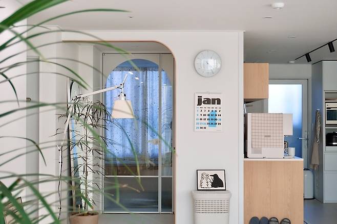 이렇게 저희 집 메인 포인트인 반 아치 가벽으로 변신했어요! 실제 구현해 놓으니 저희 집 포인트로 더 빛이 나는 거 같죠? 벽이 없는 뚫린 공간이였지만 가벽을 세워서 복도와 거실의 확실한 공간 분리 효과와 인테리어 포인트까지 노렸죠! 벽시계랑 달력을 걸어 놓기에도 아주 유용한 벽으로 재 탄생했어요.