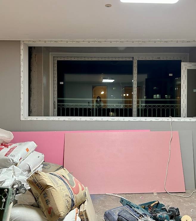 긴 창문을 철거하고 침대 프레임의 맞는 높이까지 벽을 쌓아 올려서 단열을 보강하고 샷시도 사이즈를 맞추어 시공했어요.