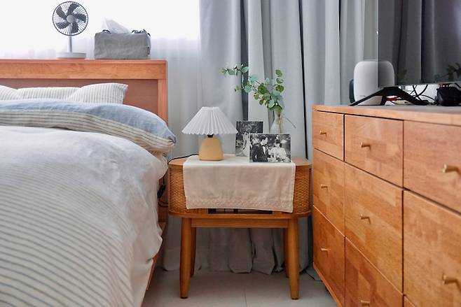 침대 옆에는 라탄협탁 하나를 놓았구요. 이 협탁도 사용하던 것이고 남는 공간에 사이즈가 알맞게 들어갔어요. 협탁 안 쪽에 공간이 꽤있어서 보관하기 용이해요.