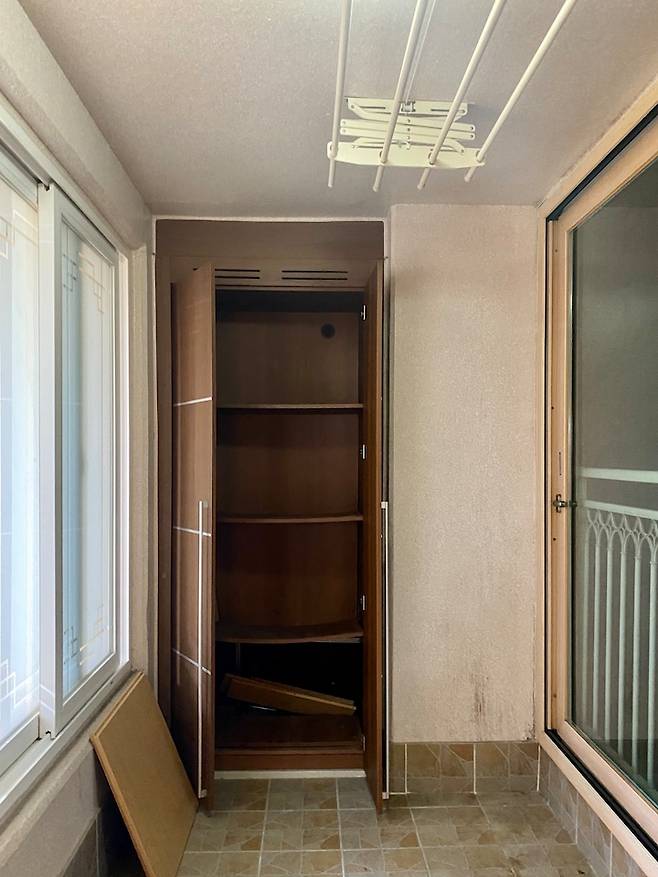 앞 베란다는 특별한 하자는 없었어요! 타일과 샷시 등 모두 전형적인 구축 아파트의 모습을 하고 있었답니다.