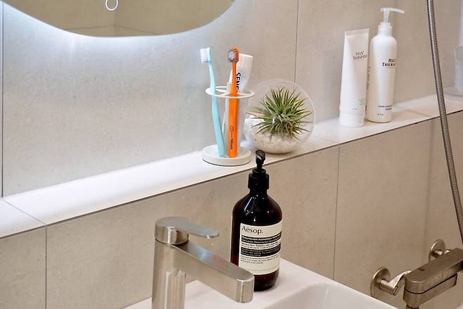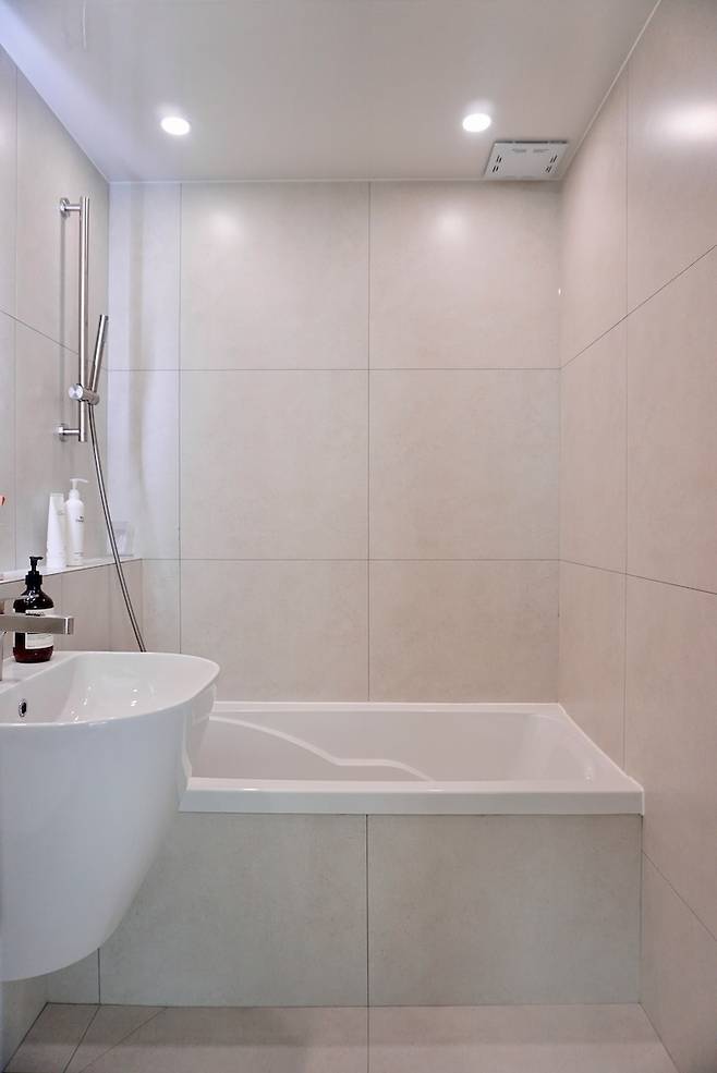 거실에 있는 욕실은 욕조를 만들어 넣었어요. 미래에 아이가 생기면 욕조가 필수라고 하더라구요!
