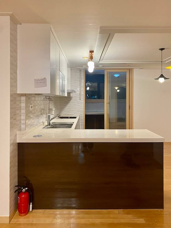 수리 전에는 이렇게 ㄱ자 주방이였어요. 냉장고장도 없었고 여러가지 조명이 달려있는 상태였어요. 뒷 베란다 문도 미닫이 도어로 단열이 잘 안되는 상태였어요.