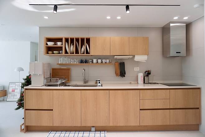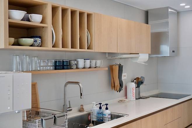 좀 더 가까이서 본 주방 모습이에요. 정수기는 얼음 정수기를 이번에 설치했구요. 저 컵이 놓여져 있는 무지주 선반은 원목으로 제가 따로 제작을 맡긴 제품이라 인테리어 업체에서 설치만 해주셨어요. 색상 차이가 걱정되었는데 다행히 상부장 가구 색상이랑 크게 이질감 없이 잘 어우러졌어요.