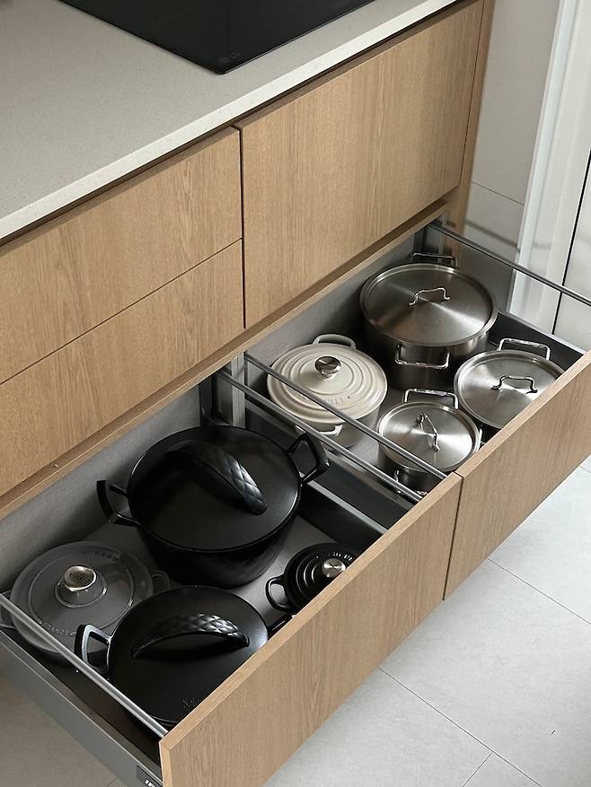 싱크볼 밑 쪽을 제외한 하부장은 전부 서랍으로 제작하였어요. 항상 무거운 냄비를 하부장 깊숙한 곳에서 꺼내는 게 너무 힘들었는데 서랍에서 꺼낼 때는 정말 신세계가 따로 없네요ㅠ