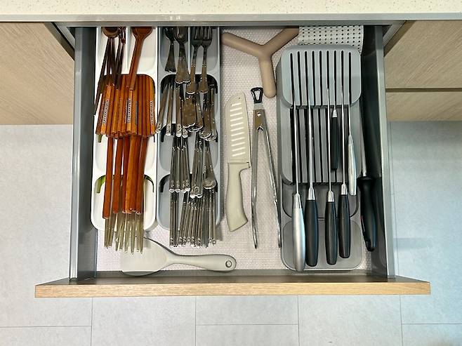 커트러리와 칼도 서랍에 착착 넣어두니 정리하기도 좋고 먼지도 안 쌓이고요.