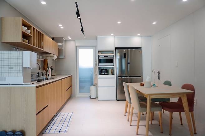 한 눈에 본 주방 모습이에요. 넓지만 않지만 효율적인 동선을 가진 주방으로 완성된 것 같아요. 어디한군데 걸리적 거리는 곳 없이 이동이 편리한 게 보이시죠!?