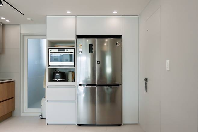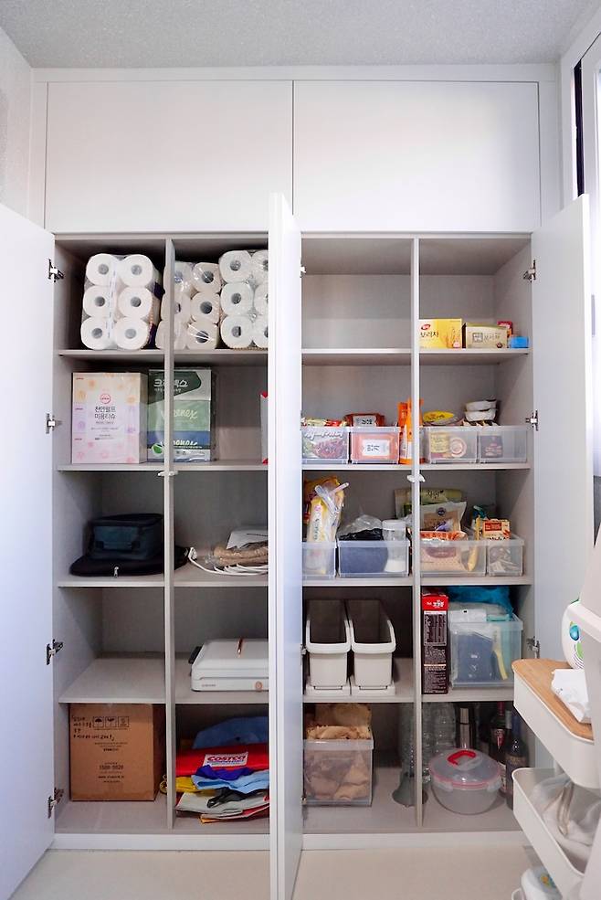 원래 보조 주방과 서브 냉장고 자리를 철거하고 팬트리 수납을 선택했어요. 뒷 베란다는 수납은 정말 주부들에게는 필수의 공간인 것 같아요.