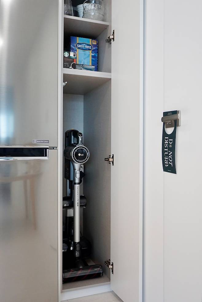 냉장고 장에 꼭 넣고 싶었던 부분 바로 청소기 수납칸인데요. 청소기가 쏙 알맞게 숨겨져서 정말 만족 중입니다.