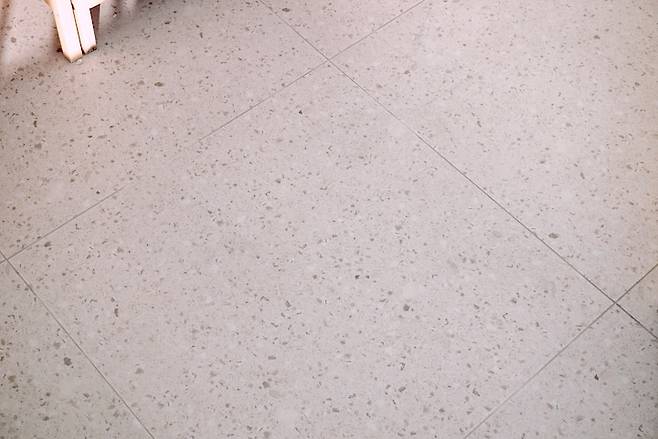 베란다 타일은 앞&뒤 베란다 동일하게 이 제품으로 골랐어요. 약간의 테라조 무늬가 베란다가 더러워지더라도 감춰주는 역할을 해줄 것 같아서 선택하게 되었어요. 색상은 꽤 밝은 편이랍니다. 시공을 정말 잘해주셔서 보고 있으면 마음이 안정되는 줄 눈 간격... 어떤 타일이던지 시공이 생명입니다. 여러분.