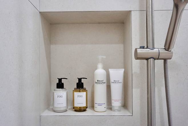 샤워부스를 만들면서 코너 선반을 달지 않고 벽 안쪽으로 박스를 만들어서 욕실 용품들을 올려 둘 수 있도록 시공하였습니다. 공간 차지를 하지 않으면서 너무 깔끔하고 좋은 선택이었다고 생각합니다. 이 부분도 완전 추천.!