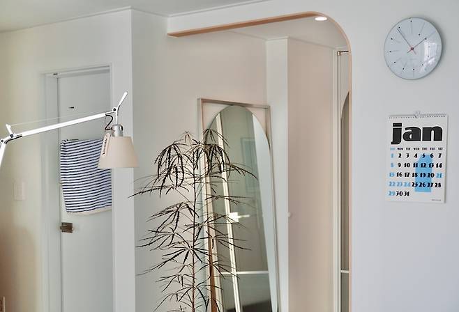 이렇게 저희 집 메인 포인트인 반 아치 가벽으로 변신했어요! 실제 구현해 놓으니 저희 집 포인트로 더 빛이 나는 거 같죠? 벽이 없는 뚫린 공간이였지만 가벽을 세워서 복도와 거실의 확실한 공간 분리 효과와 인테리어 포인트까지 노렸죠! 벽시계랑 달력을 걸어 놓기에도 아주 유용한 벽으로 재 탄생했어요.