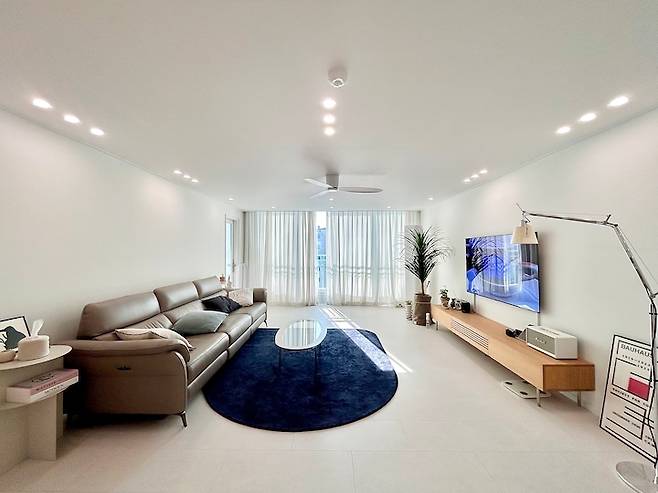 시공이 완료된 모습이에요! 자리를 바꾼 이유는 아무래도 안방 벽 쪽에 티비가 붙어있으면 소음으로 잠자리가 불편할 수 있을 것 같았고, 소파를 현관에 가까이 두면 앉아있을 때 현관에 냉기가 느껴질 것 같다는 생각이 들었기 때문이에요!